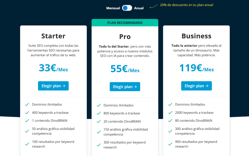 • Business → Mensual 119 €/mes • Anual 96 €/mes (1.152 € total). Tope de ~2000 keywords, 80 contenidos DinoBRAIN/mes, 300 análisis de visibilidad, 900 resultados por keyword research.